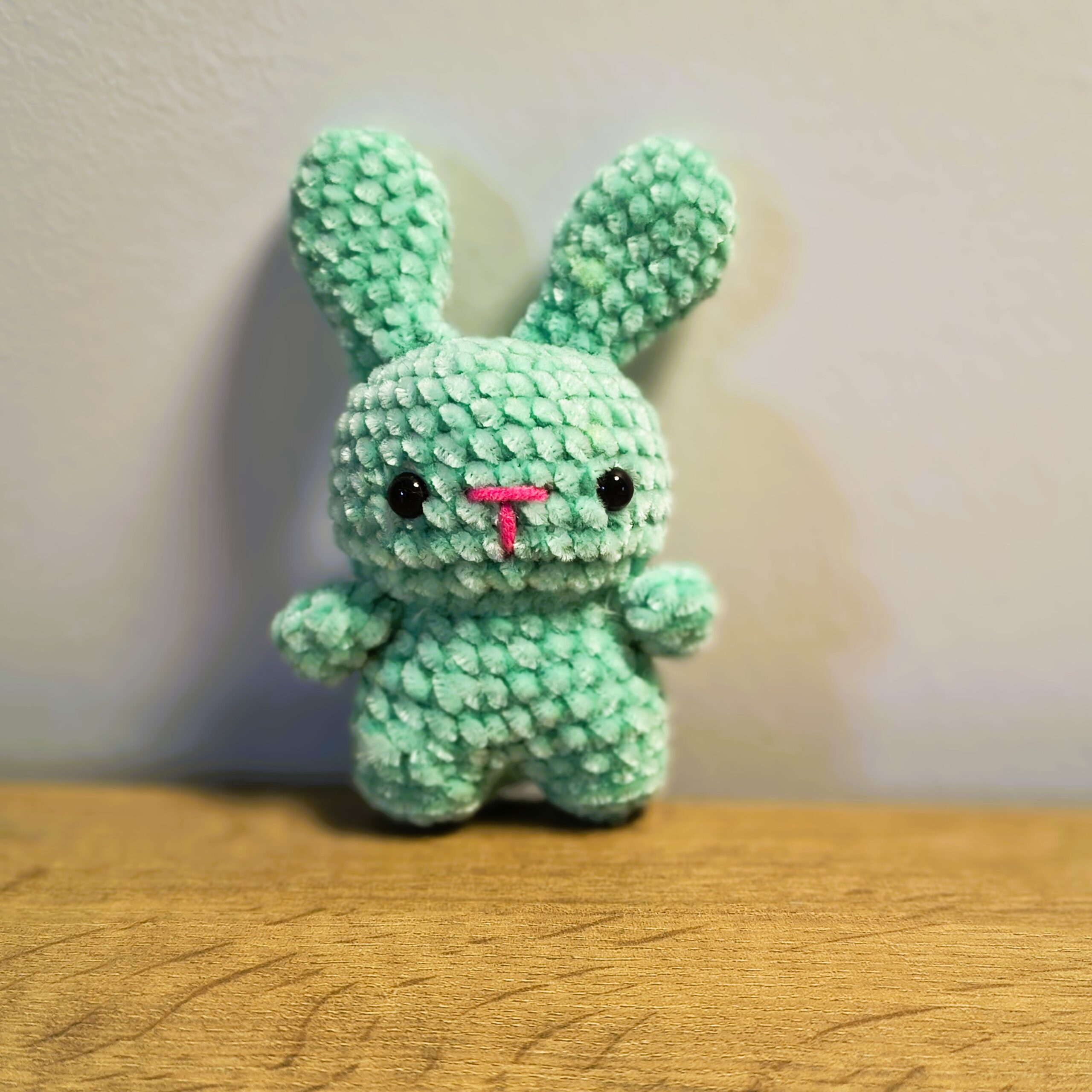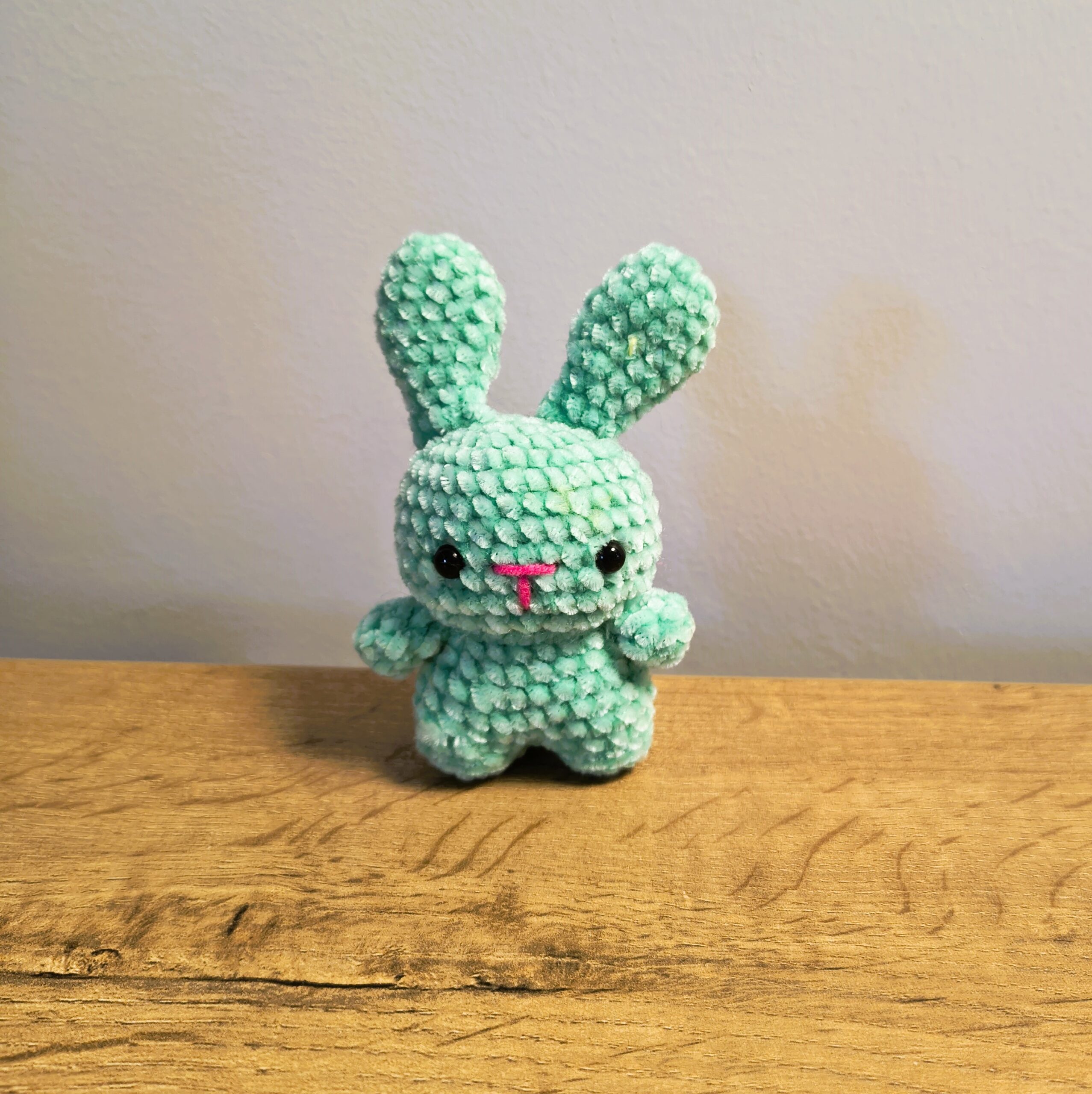 Królik robiony na szydełku ma “bezpieczne oczy”, a jego wysokość to ok. 10cm