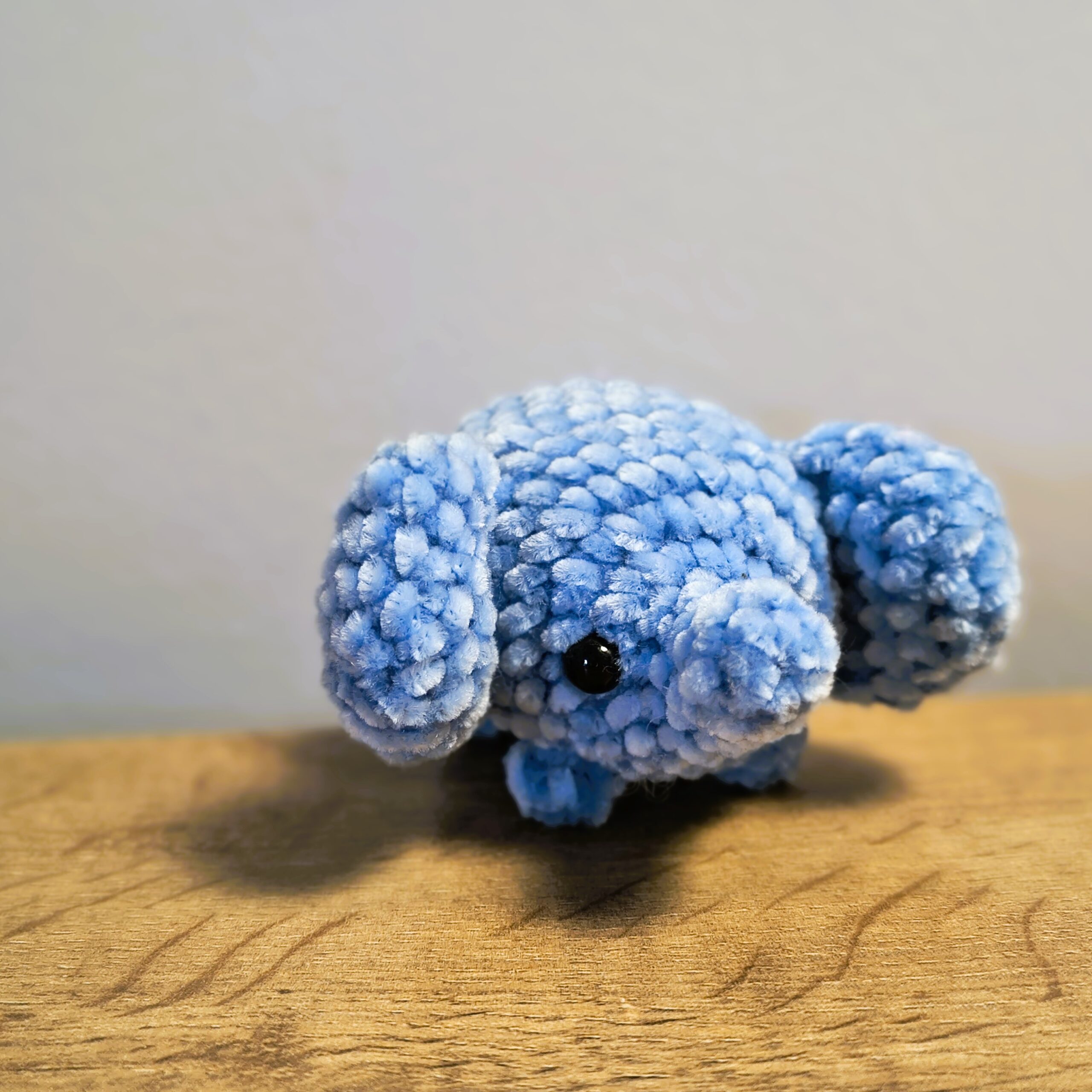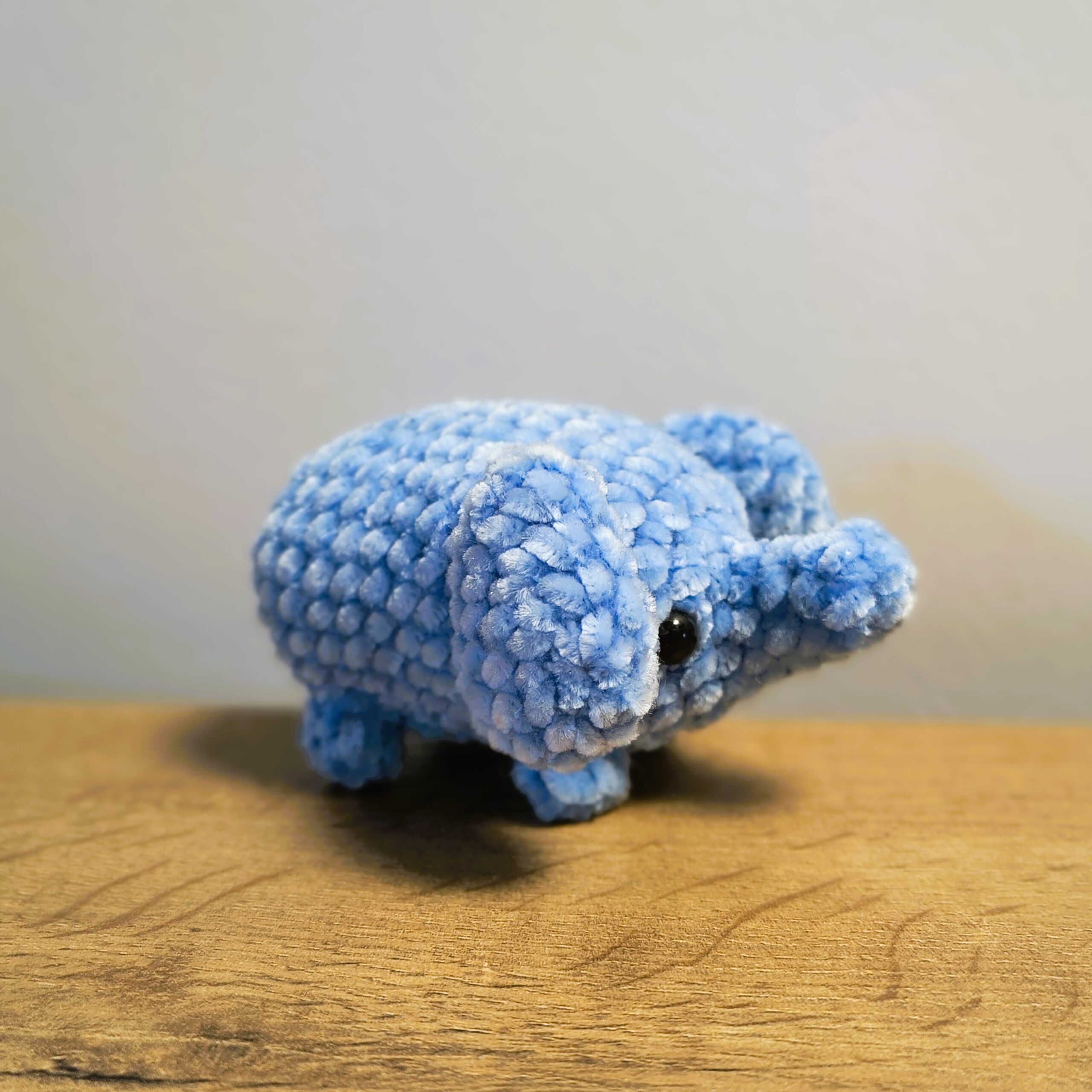 Słonik robiony na szydełku ma “bezpieczne oczy”, a jego wysokość to ok. 4cm, a długość ok. 8cm