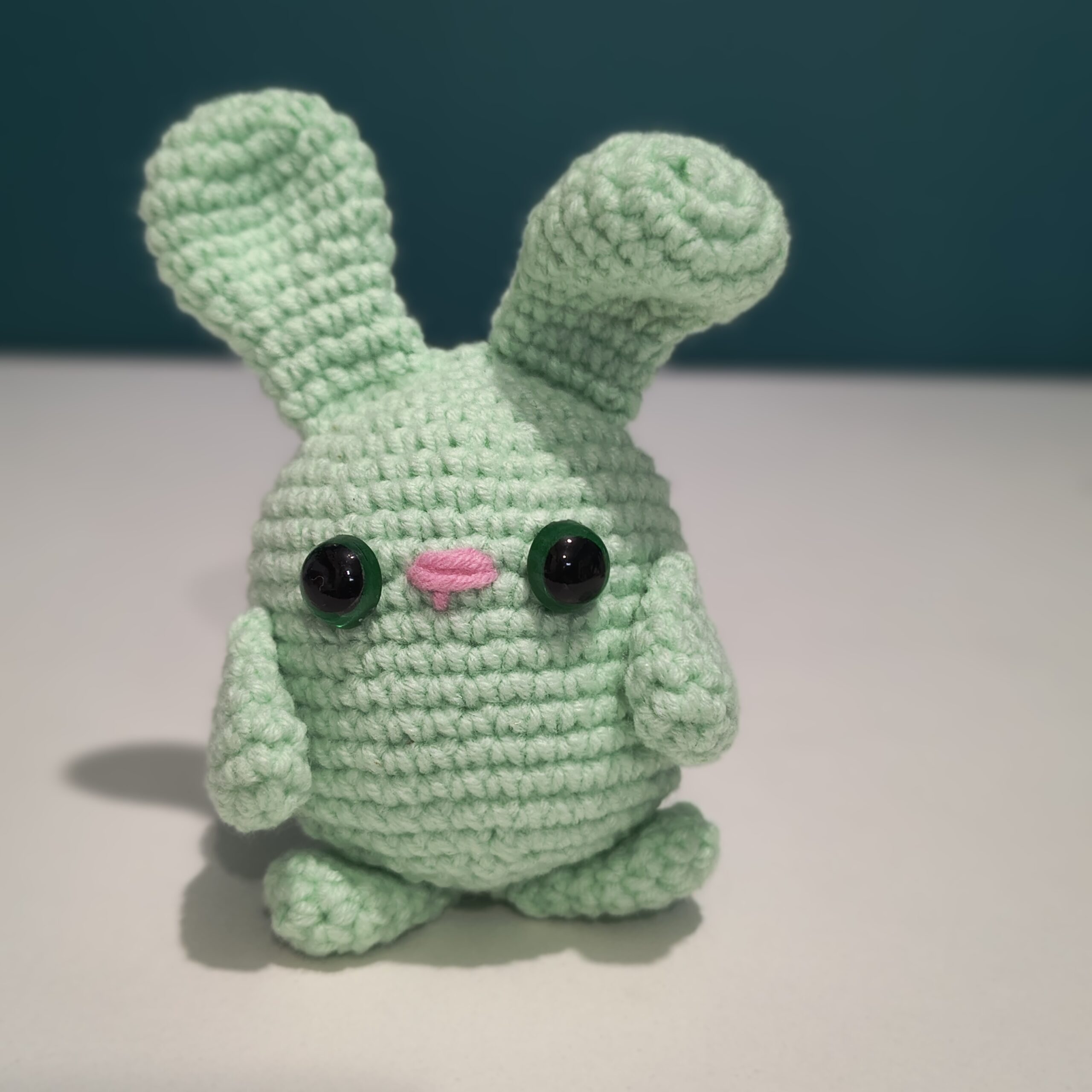 Królik robiony na szydełku ma “bezpieczne oczy”, dzięki czemu nadaje się również dla małych dzieci.